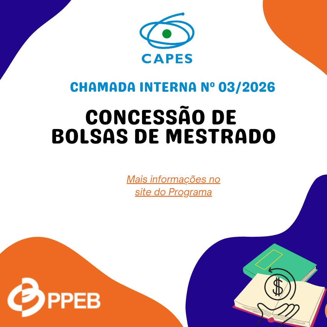 A Comissão de Bolsas do PPEB/UFPA faz saber aos Mestrandos do PPEB – Turmas 2026 que será oferecida, 2 (duas) vagas para bolsista – Bolsas de Estudos Agência CAPES e cadastro de reserva. Os/As estudantes que manifestarem interesse e se adequarem aos critérios estabelecidos pela Resolução N.º 01/2024 PPEB/NEB/UFPA em consonância com a Instrução Normativa nº 01/2023_PROPESP/UFPA e as Portarias nº133/2023_CAPES e 187/2023_CAPES, deverão realizar inscrição no período de 06 a 08 de abril de 2026, até 17h, exclusivamente pelo endereço eletrônico – e-mail: Este endereço de email está sendo protegido de spambots. Você precisa do JavaScript ativado para vê-lo..