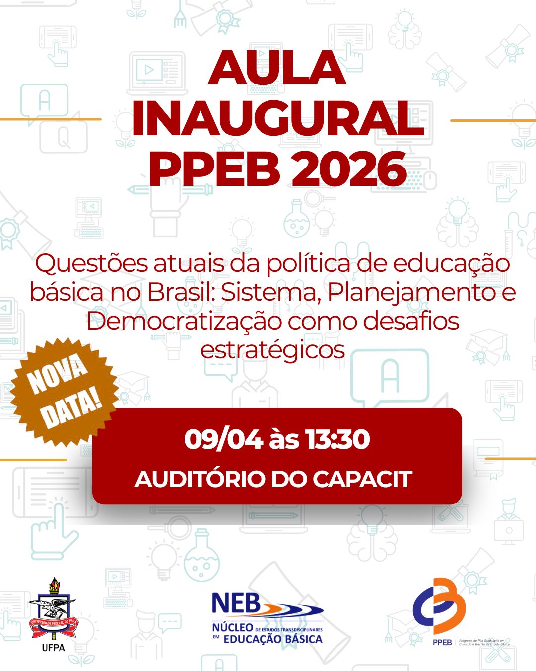 A Associação Nacional de Pós-Graduação e Pesquisa em Educação - ANPED, por meio do Fórum de Coordenadores de Programas de Pós-Graduação em Educação - FORPRED NORTE, realiza na Universidade Federal do Pará, no dia 04 de junho de 2025, das 9h às 12h e das 14h às 16h, no Auditório Setorial do Básico I, o evento ANPED NA COP-30 – UNIVERSIDADE E EDUCAÇÃO NA AMAZÔNIA*, com a temática *"Educação na Amazônia e Mudanças Climáticas: para além das relações de mercado - por modos de reprodução ampliada da vida".
