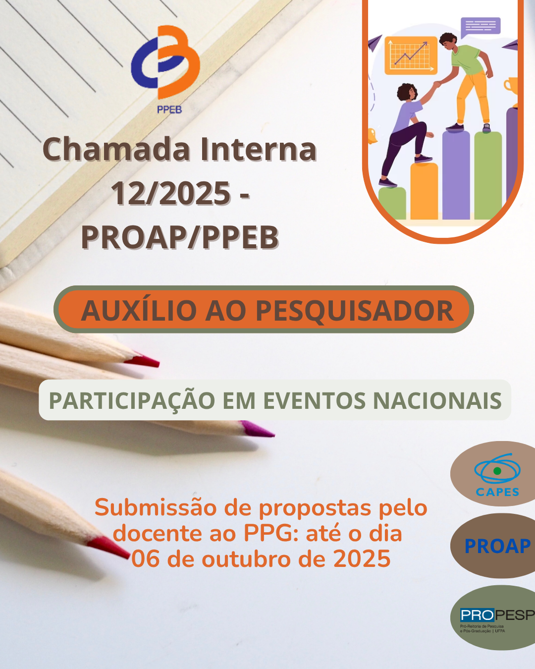 O Programa de Pós-Graduação em Currículo e Gestão da Escola Básica (PPEB) torna público a chamada interna que estabelece as regras de seleção, no âmbito do Programa de Apoio à Pós-Graduação (PROAP)/CAPES, dos pedidos de concessão de recursos financeiros aos docentes permanentes do PPEB para a participação em eventos científicos nacionais, em formato presencial, para apresentação de trabalhos científicos originais. O PROAP é coordenado pela Diretoria de Pós-Graduação (DPG) da PROPESP, com a supervisão e aprovação dos pedido de Concessão de recursos financeiros pelo PPEB, contemplado pelo PROAP/CAPES 2025, cujo recurso é gerenciado pela PROPESP, seguindo normas da Portaria nº 156 da CAPES, de 28 de novembro de 2014.