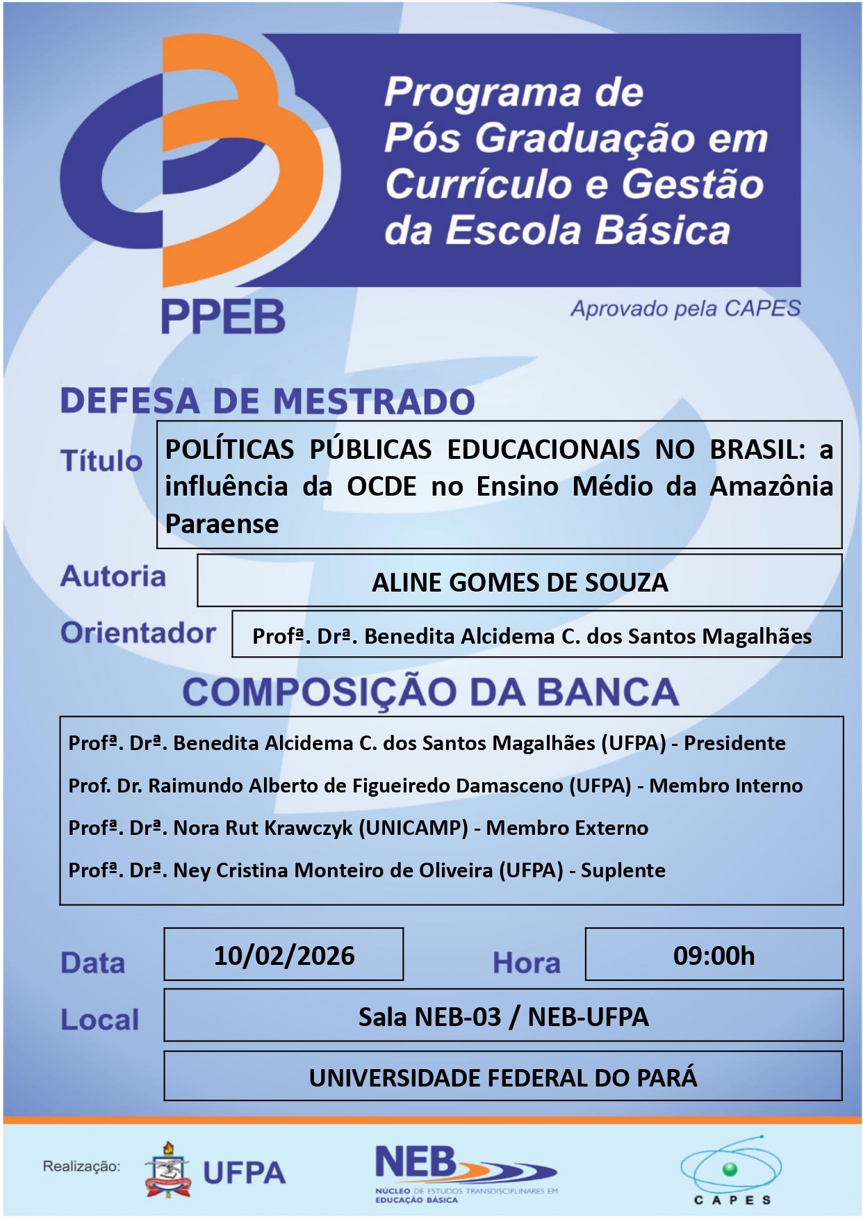 O Programa de Pós Graduação em Currículo e Gestão da Escola Básica da UFPA tem a satisfação de convidar a todos(as) para apreciar a Defesa do(a) Mestrando(a) ALINE GOMES DE SOUZA, que ocorrerá em 10/02/2026, às 09h00min, na Sala NEB-03/NEB-UFPA.