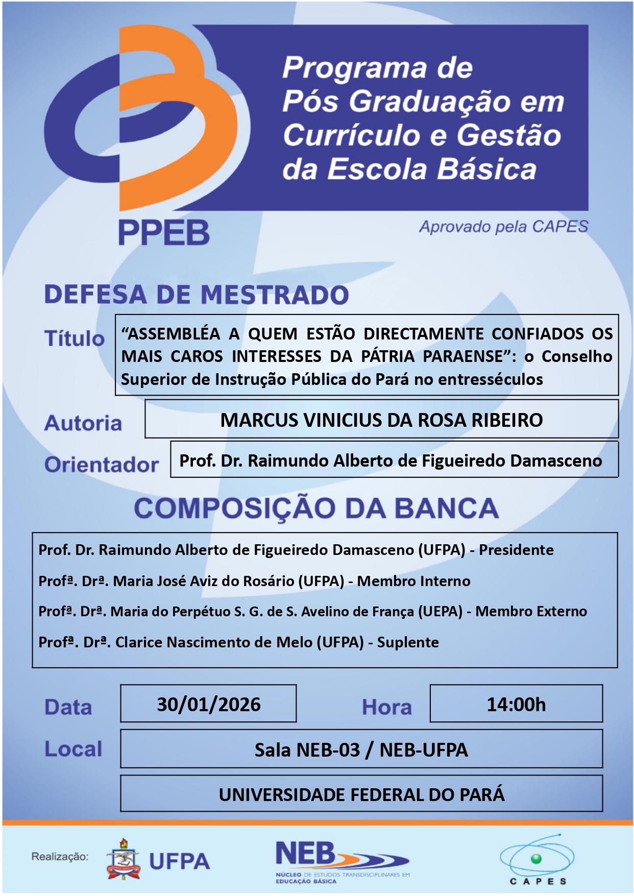 O Programa de Pós Graduação em Currículo e Gestão da Escola Básica da UFPA tem a satisfação de convidar a todos(as) para apreciar a Defesa do(a) Mestrando(a) MARCUS VINICIUS DA ROSA RIBEIRO, que ocorrerá em 30/01/2026, às 14h00min, na Sala NEB-01/NEB-UFPA.