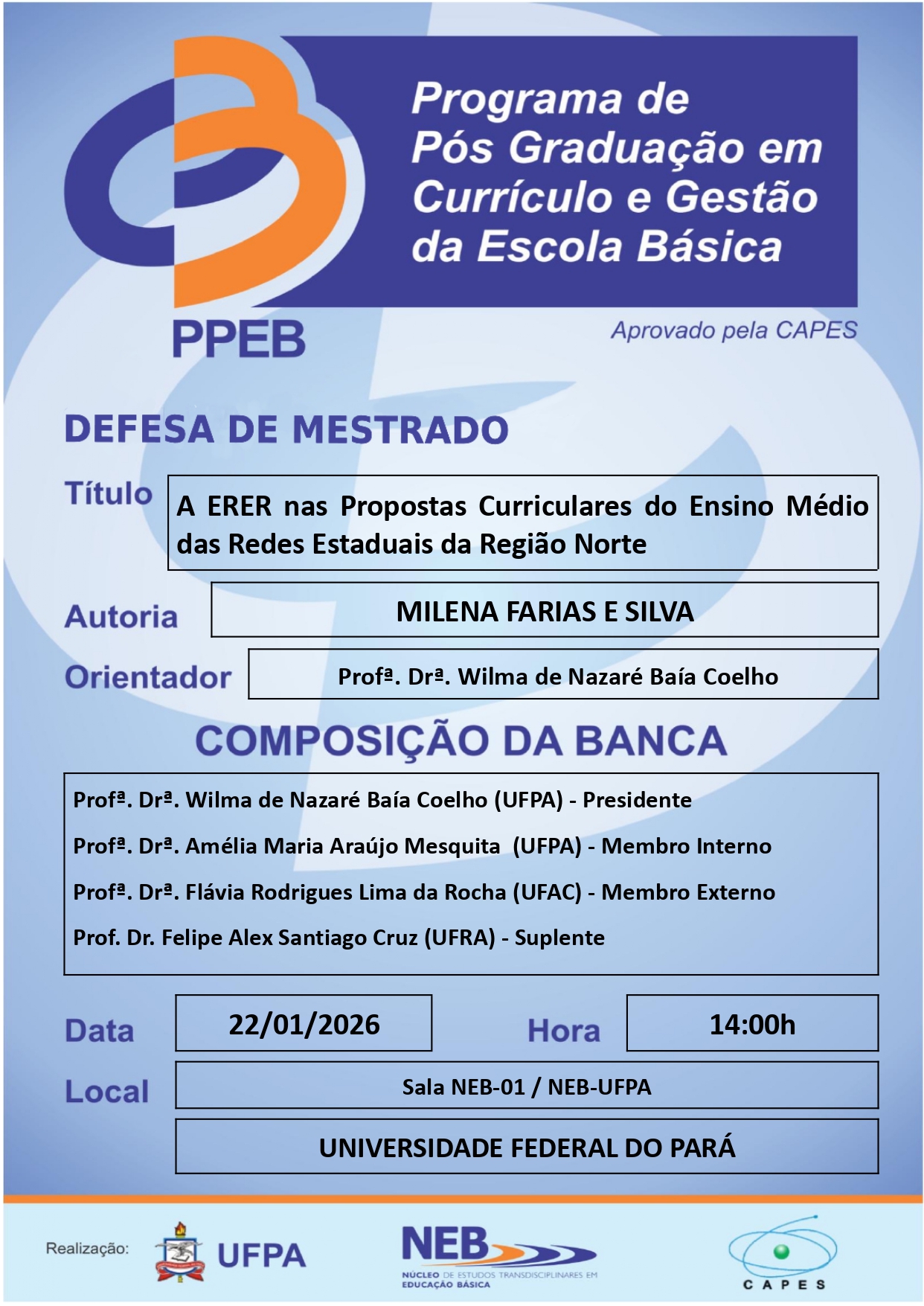 O Programa de Pós Graduação em Currículo e Gestão da Escola Básica da UFPA tem a satisfação de convidar a todos(as) para apreciar a Defesa do(a) Mestrando(a) MILENA FARIAS E SILVA, que ocorrerá em 22/01/2026, às 14h00min, na Sala NEB-01/NEB-UFPA.