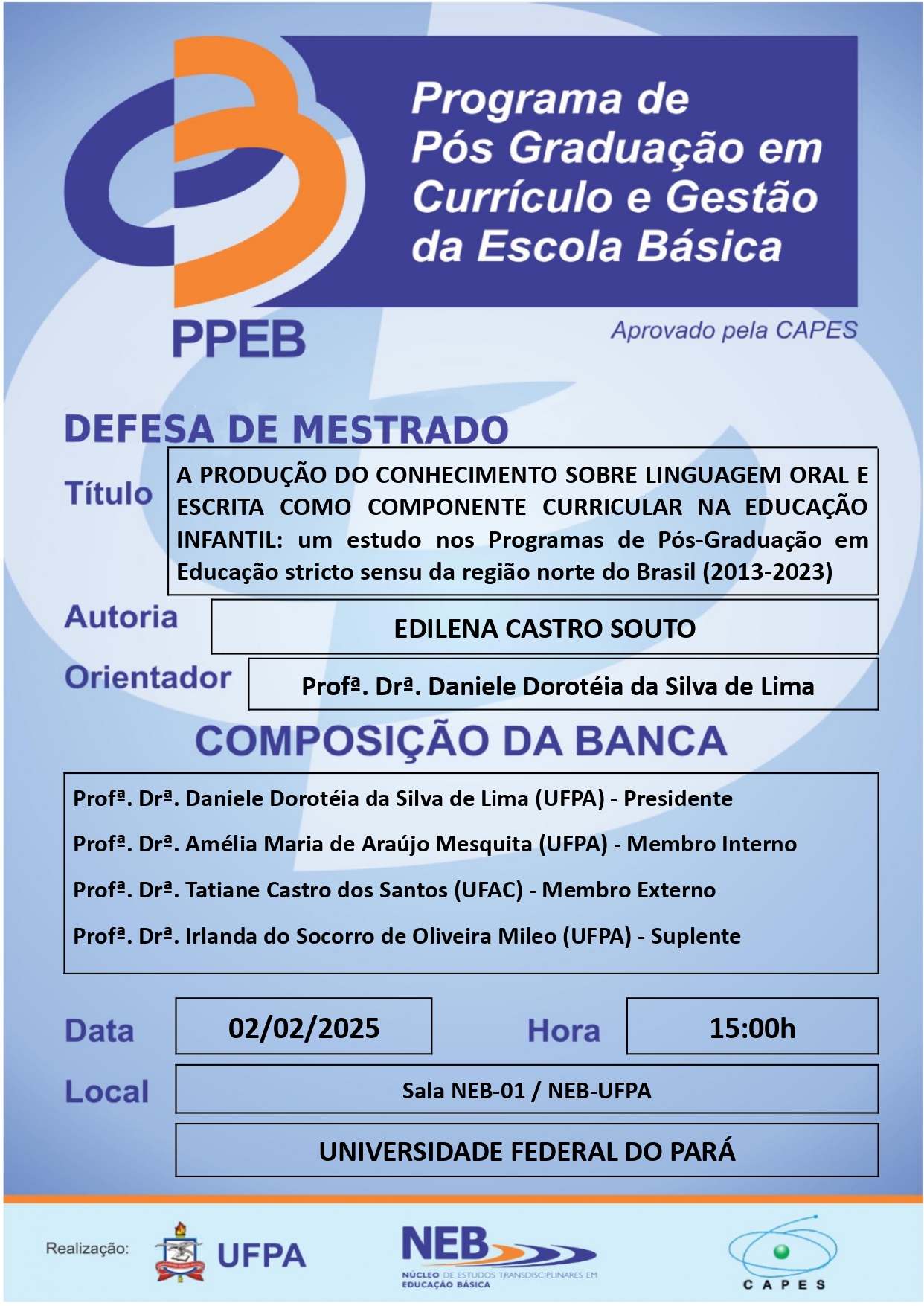 O Programa de Pós Graduação em Currículo e Gestão da Escola Básica da UFPA tem a satisfação de convidar a todos(as) para apreciar a Qualificação do(a) Mestrando(a) EDILENA CASTRO SOUTO, que ocorrerá em 02/02/2026, às 14h00min, na Sala NEB-01/NEB-UFPA.