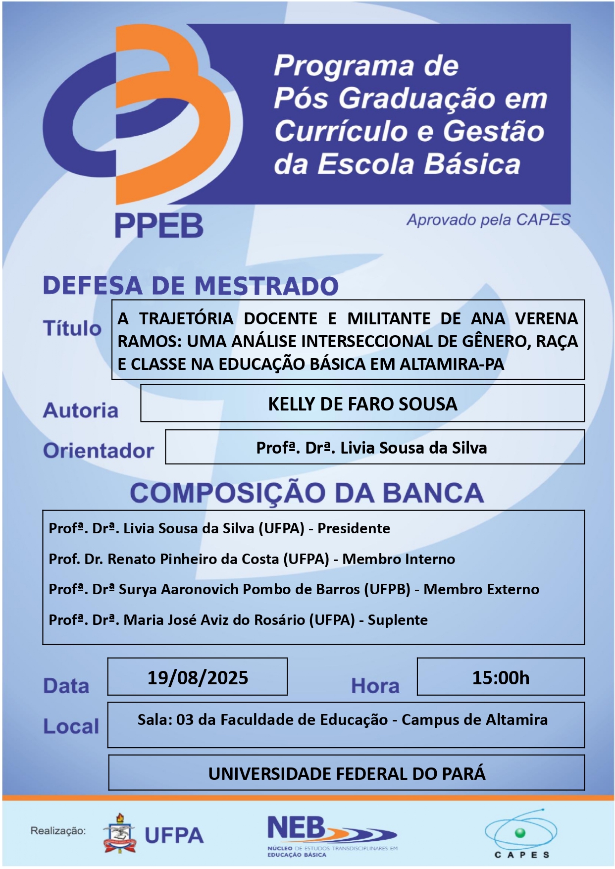 O Programa de Pós Graduação em Currículo e Gestão da Escola Básica da UFPA tem a satisfação de convidar a todos(as) para apreciar a Defesa do(a) Mestrando(a) KELLY DE FARO SOUSA, que ocorrerá em 19/08/2025, às 15h00min, na Sala: 03 Faculdade de Educação - Campus Altamira - UFPA.