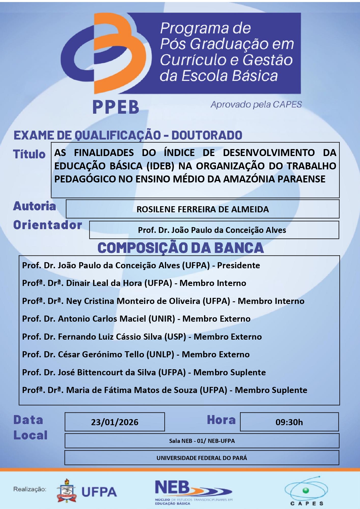 O Programa de Pós Graduação em Currículo e Gestão da Escola Básica da UFPA tem a satisfação de convidar a todos(as) para apreciar a Qualificação do(a) Mestrando(a) ROSILENE FERREIRA DE ALMEIDA, que ocorrerá em 23/01/2026, às 09h30min, na Sala NEB-01/NEB-UFPA.