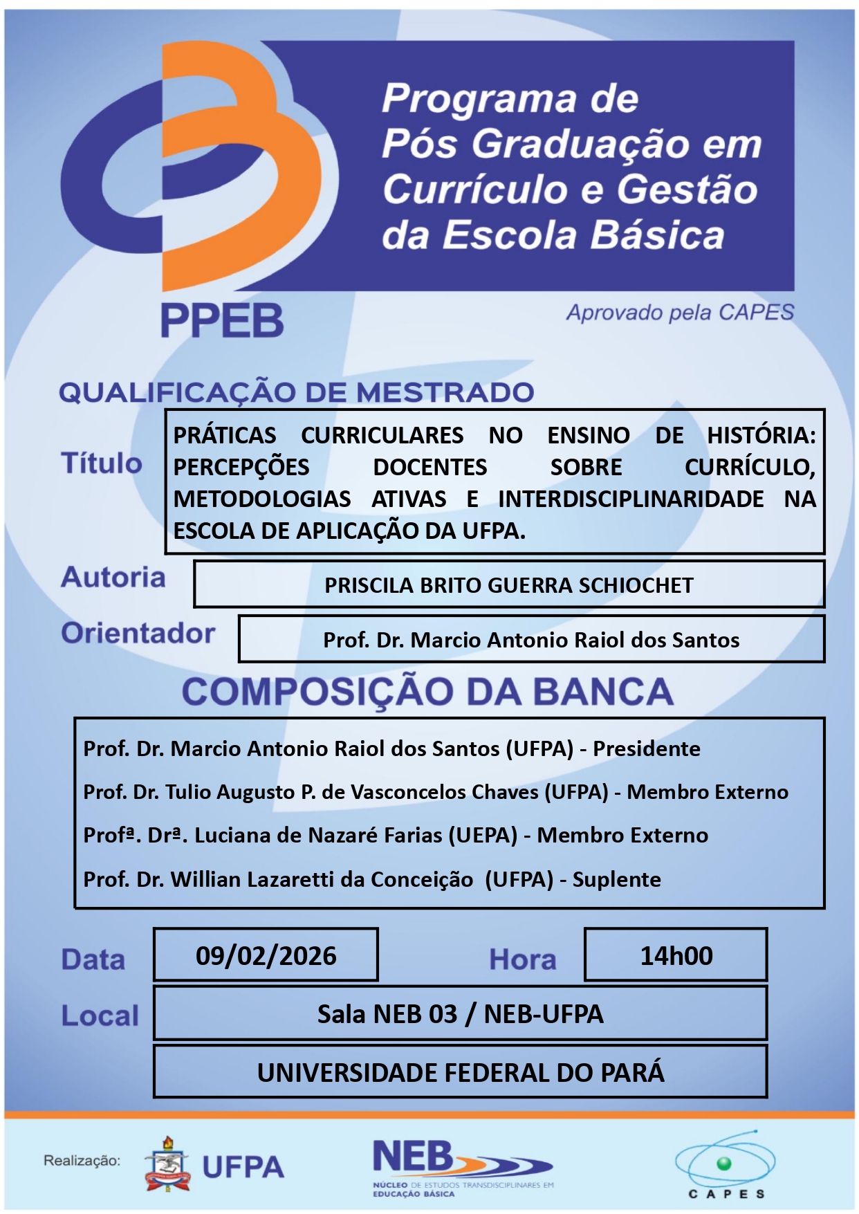 O Programa de Pós Graduação em Currículo e Gestão da Escola Básica da UFPA tem a satisfação de convidar a todos(as) para apreciar a Qualificação do(a) Mestrando(a)PRISCILA BRITO GUERRA SCHIOCHET , que ocorrerá em 09/02/2026, às 14h00min, na Sala NEB-03/NEB-UFPA.