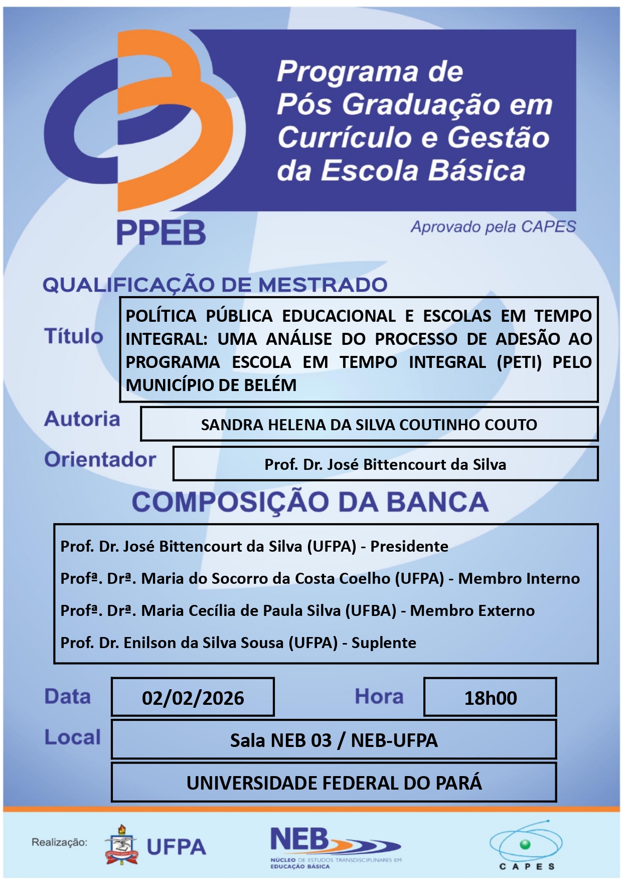 O Programa de Pós Graduação em Currículo e Gestão da Escola Básica da UFPA tem a satisfação de convidar a todos(as) para apreciar a Qualificação do(a) Mestrando(a) SANDRA HELENA DA SILVA COUTINHO, que ocorrerá em 02/02/2026, às 18h00min, na Sala NEB-03/NEB-UFPA.