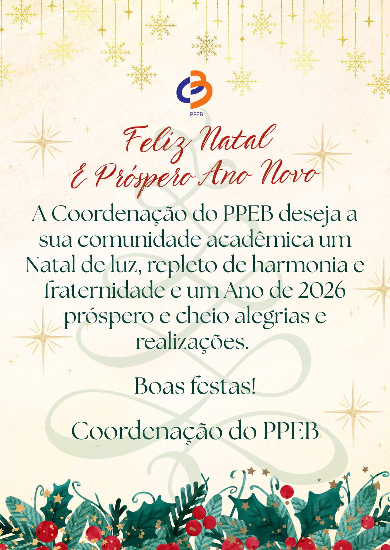 A Coordenação do PPEB deseja a sua comunidade acadêmica um Natal de luz, repleto de harmonia e fraternidade e um Ano de 2026 próspero e cheio alegrias e realizações.